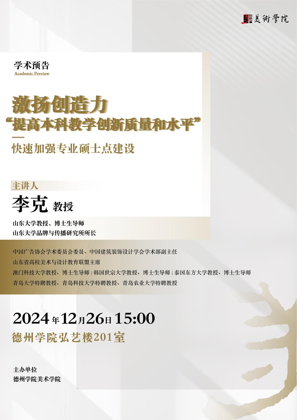【来源:学术预告:山东大学李克教授 激扬创造力“提高本科教学创新质量和水平” | 发布日期:2024-12-26 】