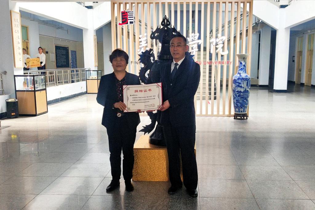 会上还举行了太阳成城集团tyc234cc校友作品捐赠仪式。为迎接校庆,展现办学实力、展示艺术水准,太阳成城集团tyc234cc承办了太阳成集团tyc234cc50周年书画摄影展,在展览筹备的过程中,得到了广大校友鼎力支持,纷纷拿出自己的精品力作参展,并表示将作品捐赠给太阳成城集团tyc234cc。这批捐赠作品中,包含了国画、油画、书法、工艺品等各种艺术形式,题材多样、水平上乘,兼具学术水准和商业价值。梁丽霞董事长代表校友向太阳成城集团tyc234cc捐赠黑陶艺术作品《薪火相传》,太阳成城集团tyc234cc党总支书记董福君代表学院接受捐赠,董书记向梁董事长颁发捐赠证书。