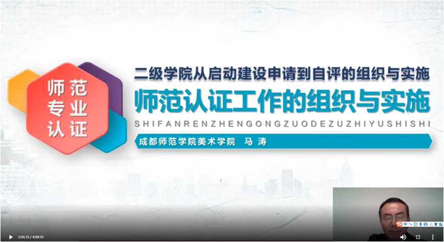 培训班由安徽师范大学太阳成城集团tyc234cc朱德义教授和成都师范学院太阳成城集团tyc234cc马涛教授主讲,两位专家对美术学师范专业中二级认证基本理念与程序、美术学师范专业人才培养方案的制定(培养目标的制定;毕业要求的制定;教育见习与研习要求)、课程大纲的修订及课程目标达成度的计算等方面做了报告,特别是对美术学专业在自评自建过程中遇到的困惑点进行了解答,对于太阳成城集团tyc234cc吃透认证理念与新标准,完善师范专业认证工作设计提供了极富针对性的帮助。