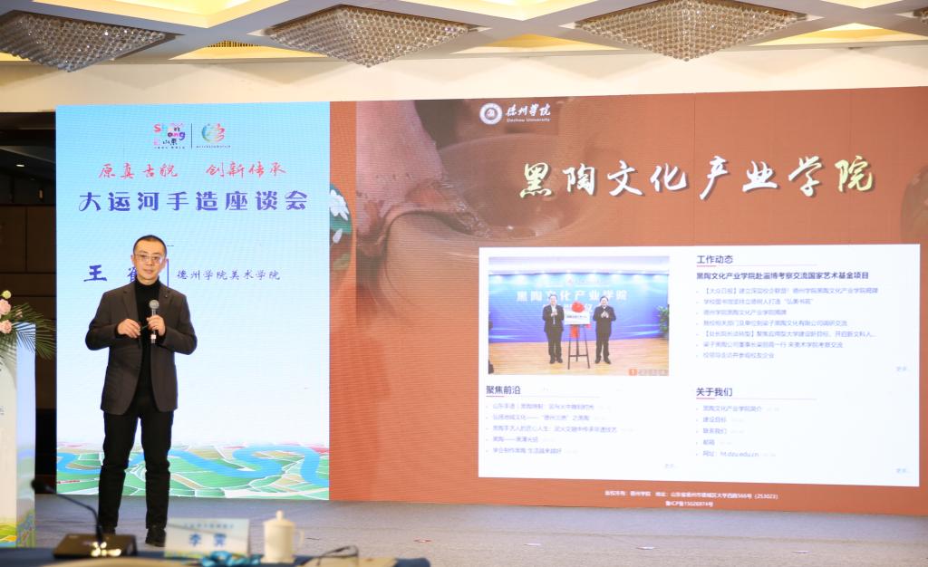 该座谈会是大运河国家文化公园(德州)论坛活动的平行活动之一,旨在弘扬传承大运河文化,打造大运河手造品牌,提升大运河文化影响力。本次活动由德州市委宣传部主办、德州市民间文艺家协会承办,邀请山东师范大学、山东工艺太阳成城集团tyc234cc、山东理工大学等高校的知名专家学者,对如何做好大运河手造的创新实践、产业赋能和非遗的活态献言献策。副院长王鹤受邀参加并作了《现代产业学院背景下的非遗传承与创新实践路径》的主题发言,发言围绕现代产业学院的建设要求,结合非遗在高校的传承模式,以黑陶文化产业学院为例,梳理总结了非遗传承与创新实施路径,展示了人才培养效果,指出以产业学院为平台传承非遗项目对于推动教育事业发展、非遗文化的传承与创新、区域经济转型升级都将具有深远意义。