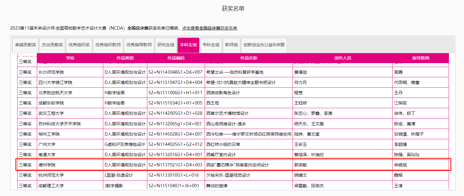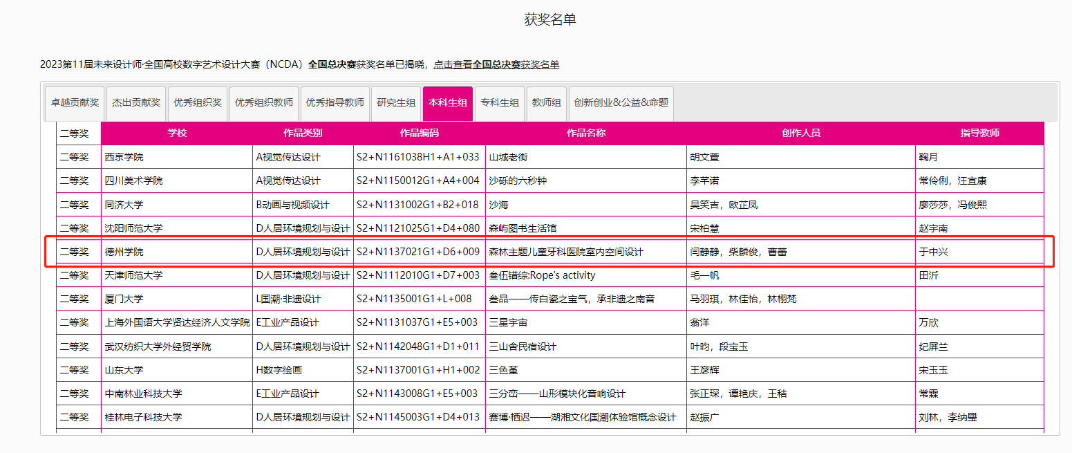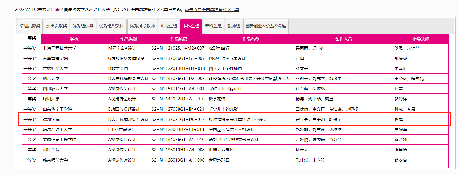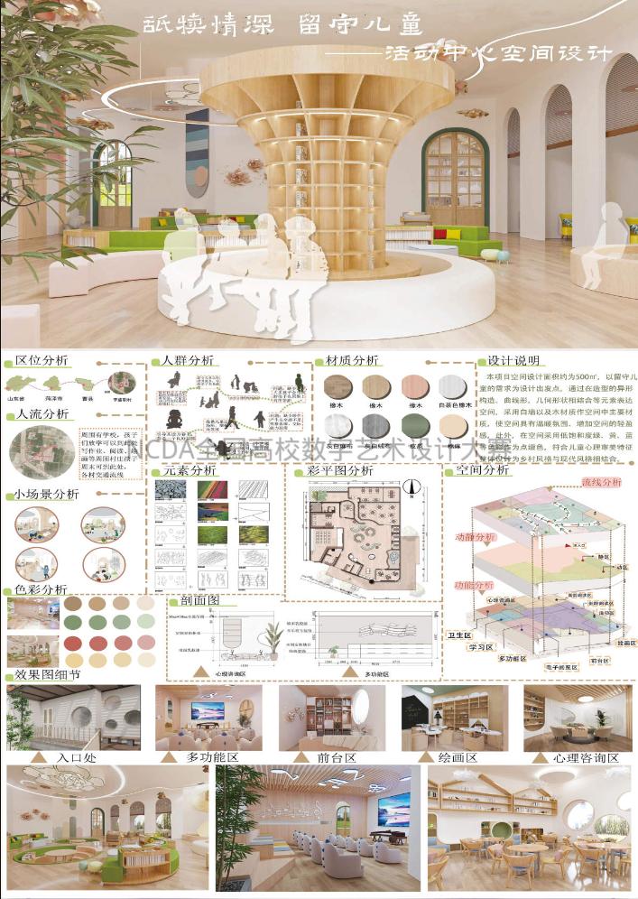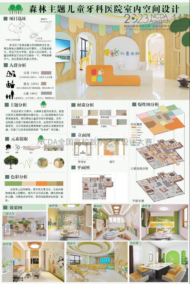 8月25日,2023第11届未来设计师·全国高校数字艺术设计大赛(NCDA)全国总决赛奖项公布,太阳成城集团tyc234cc三项作品榜上有名,取得了优异成绩。其中由杨博老师指导,霍升亮、吕秉阳、韩振宇创作的作品《舐犊情深留守儿童活动中心设计》拔得头筹,喜获全国总决赛一等奖;由于中兴老师指导,闫静静、柴麟俊、曹蕾同学创作的作品《森林主题儿童牙科医院室内空间设计》获得全国总决赛二等奖;由申晓旭老师指导、郭淑敏同学创作的作品《西安"墨石镌华"民宿室内空间设计》获得全国总决赛三等奖。