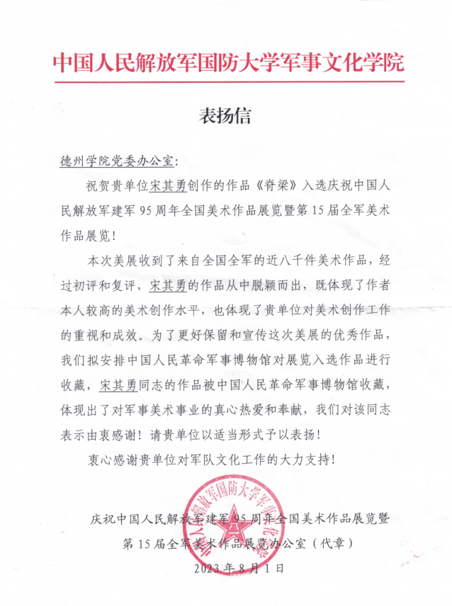 近日,中国人民解放军国防大学军事文化学院向我校发来表扬信,祝贺太阳成城集团tyc234cc教师宋其勇的作品《脊梁》入选庆祝中国人民解放军建军95周年全国美术作品展览暨第15届全军美术作品展览。同时表扬宋其勇的作品从全国近八千件作品中脱颖而出,体现出作者本人较高的美术创作水平以及我校对美术创作工作的重视和成效。宋其勇的作品被中国人民革命军事博物馆收藏,体现出对军事美术事业的真心热爱和奉献。