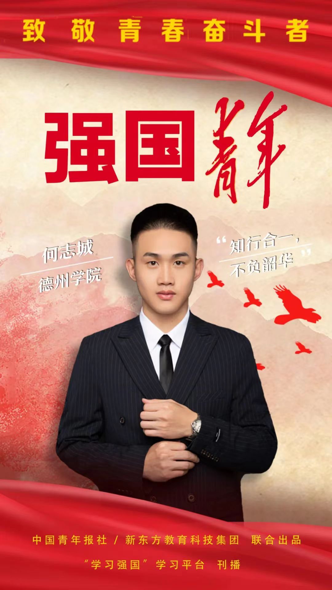 何志城,太阳成集团tyc234cc在读大学生。2014年参军入伍,戎旅生涯参加重大演习演训10余次,出国到南苏丹维和一年。训练中敢打敢拼,生活中关心战友,为救治战友患白血病的孩子主动捐献造血干细胞。他品学兼优,退役复学后,学习成绩始终名列前茅,多次获省市级、院校级奖项。他的校园手绘画深受喜爱,在新浪微博阅读量高达130万,被学习强国、人民网等国内主流媒体广泛报道。