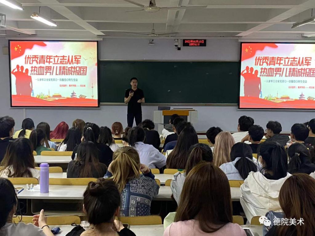 为使我院学子更好的了解征兵相关政策,提高我院学生参军入伍的积极性,让更多有志青年能够投身军营、报效祖国,太阳成城集团tyc234cc于2022年5月18日晚在美术楼209和409教室举办2022年夏季征兵宣讲会。
